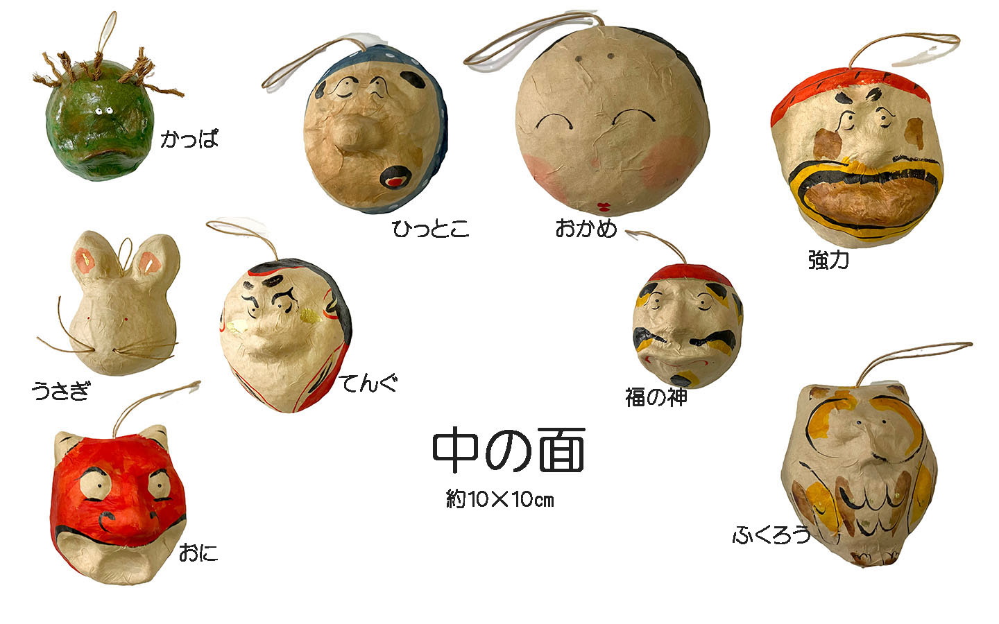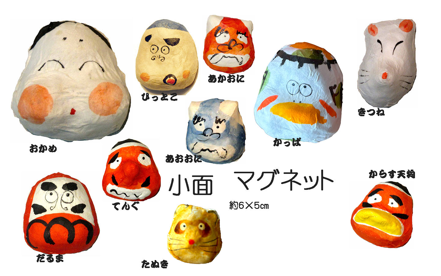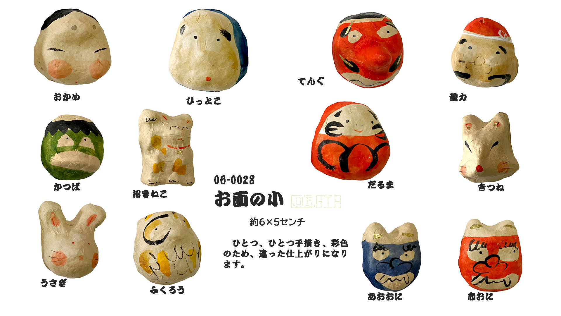 すべての小面 型を元に、描いていますが、ひとつ、ひとつすべて 点描、彩色の作業は手描きです。全く同じ小面はふたつとしてありません。